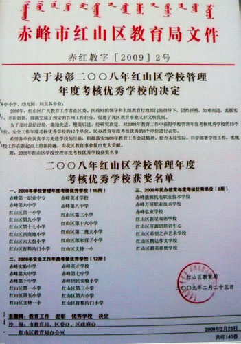 >>>2009赤红教字(2009)2号文件中唯一被评优的作文学校